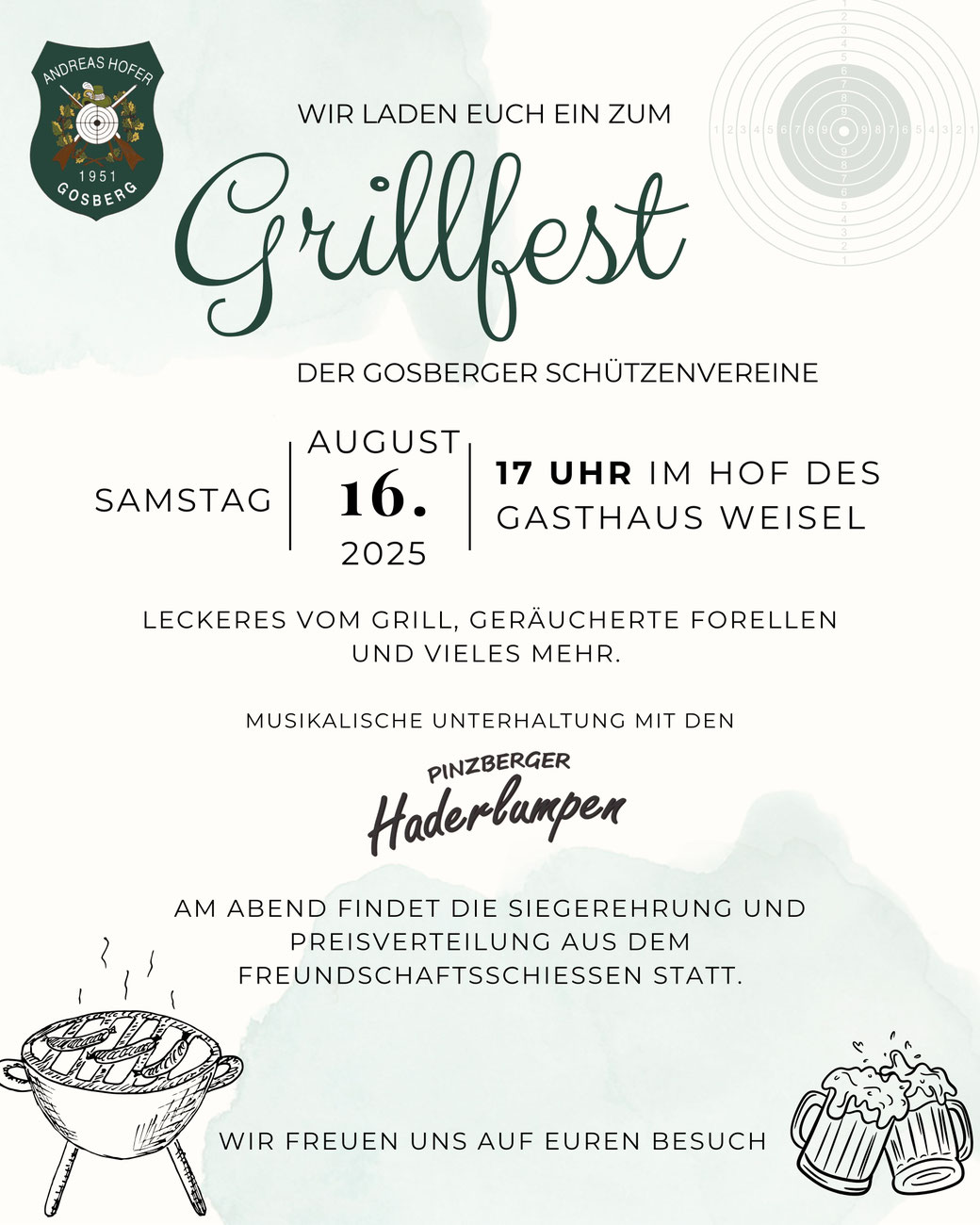 Am Samstag, den 16. August 2025 findet ab 17 Uhr das gemeinsame Grillfest der beiden Gosberger Schützenvereine statt.